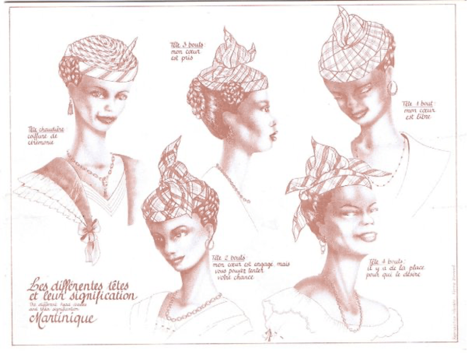 By tying their headgear differently, women from Martinique could signal their sexual availability to man. Clockwise from far left: ‘ceremony wear’, ‘my heart is taken’, ‘my heart is your to take’, ‘there is space for whoever wishes’ and my favourite of all, ‘my heart is taken but you can give it a try’. Image source.