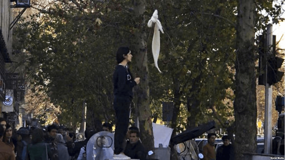 Iran. January 2018: a wave of protests sweeps the country. A woman stands above the crowd: a stick on her hand, a white scarf at the end of it, her head bare.