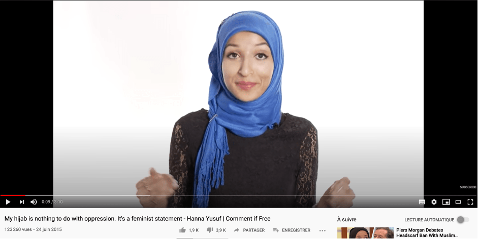 The first video I chose is the one by Hannah Yusuf[6]. She is a journalist filming her opinion for a major national newspapers’ – The Guardian – online site. We can assume she has carefully constructed her discourse to be as effective as possible in three minutes. The video has been shared both on YouTube, where it has more than 80 000 views, and on The Guardian website, with thousands of comments.