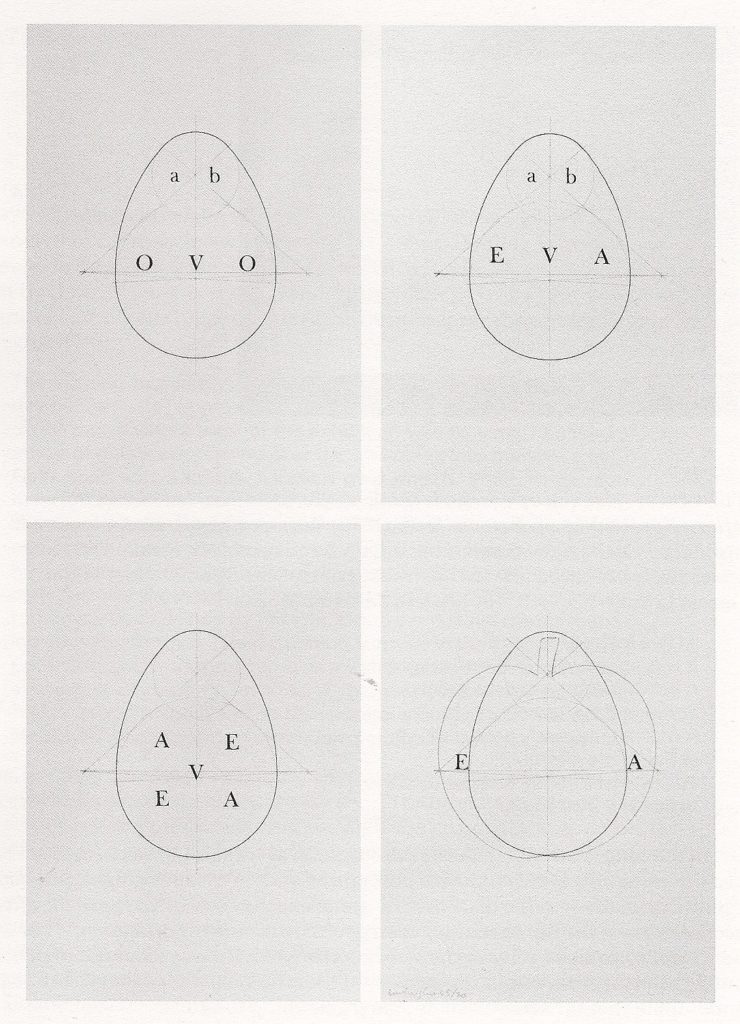 De l’œuf à Ève, jusqu’à la pomme. Le chemin de la subjectivité féminine mêlant l’organique, le rationnel (la géométrie) et la langue.