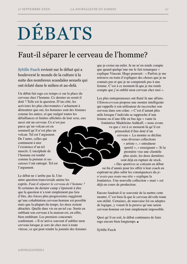 Dans un univers parallèle existe un journal à tirage national à renommée internationale: La Journaleuse du Samedi. Nous reproduisons ici une sélection des meilleurs articles pour les femmes de notre univers.