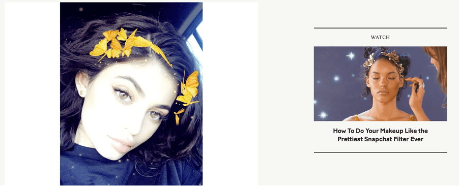 The first picture is a screenshot from Ariana Grande’s ‘7 rings‘ clip. The cat ears are reminecent of the puppy or cat filter used on snapchat (see second photo). The third photo is a screenshot from a Vogue article on celebrities’ best animal filters. The ad on the right of the screen direct readers to a video to learn how to wear make up to look like filters. The final picture is a screenshot from the TV series Years and Years. In that scene the teenage girl announces to her parents that she is ‘transhuman’ and that she is going to ‘become digital’, by living in the cloud.