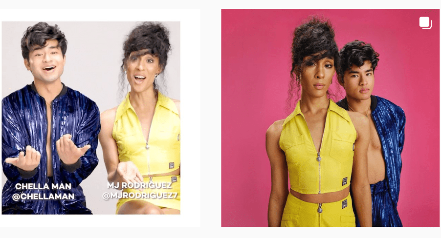 Anche gli uomini sono invitati a adottare stereotipi associati al sesso opposto e pure a modificarsi fisicamente per renderli più credibili. Ecco un esempio: la modella Chella Man (in blu) è una donna e l’attore MJ Rodriguez (in giallo) è un uomo, ma ci è richiesto di pensare il contrario. Perché? Semplicemente per i loro vestiti, i manierismi, le loro acconciature – stereotipi.