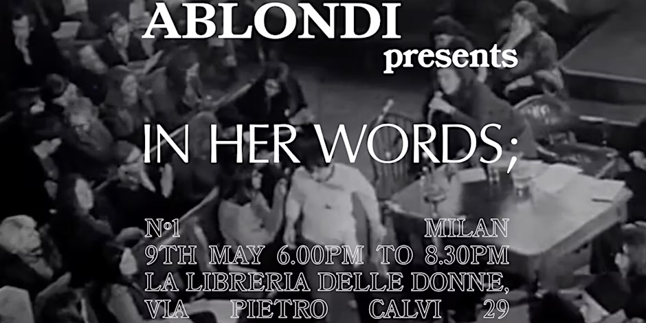Non so chi legge - no, so di una, due persone che leggono - non so chi può venire -nessuna delle due - ma so che io, grazie alla marca di prêt-à-porter femminile ABLONDI sarò a Milano questo venerdì 9 maggio: https://www.eventbrite.it/e/biglietti-in-her-words-n1-milan-1345362638869 Alla Libreria delle Donne commenterò il documentario Il Corpo delle Donne (2009) di… Continue reading Ci vediamo a Milano !